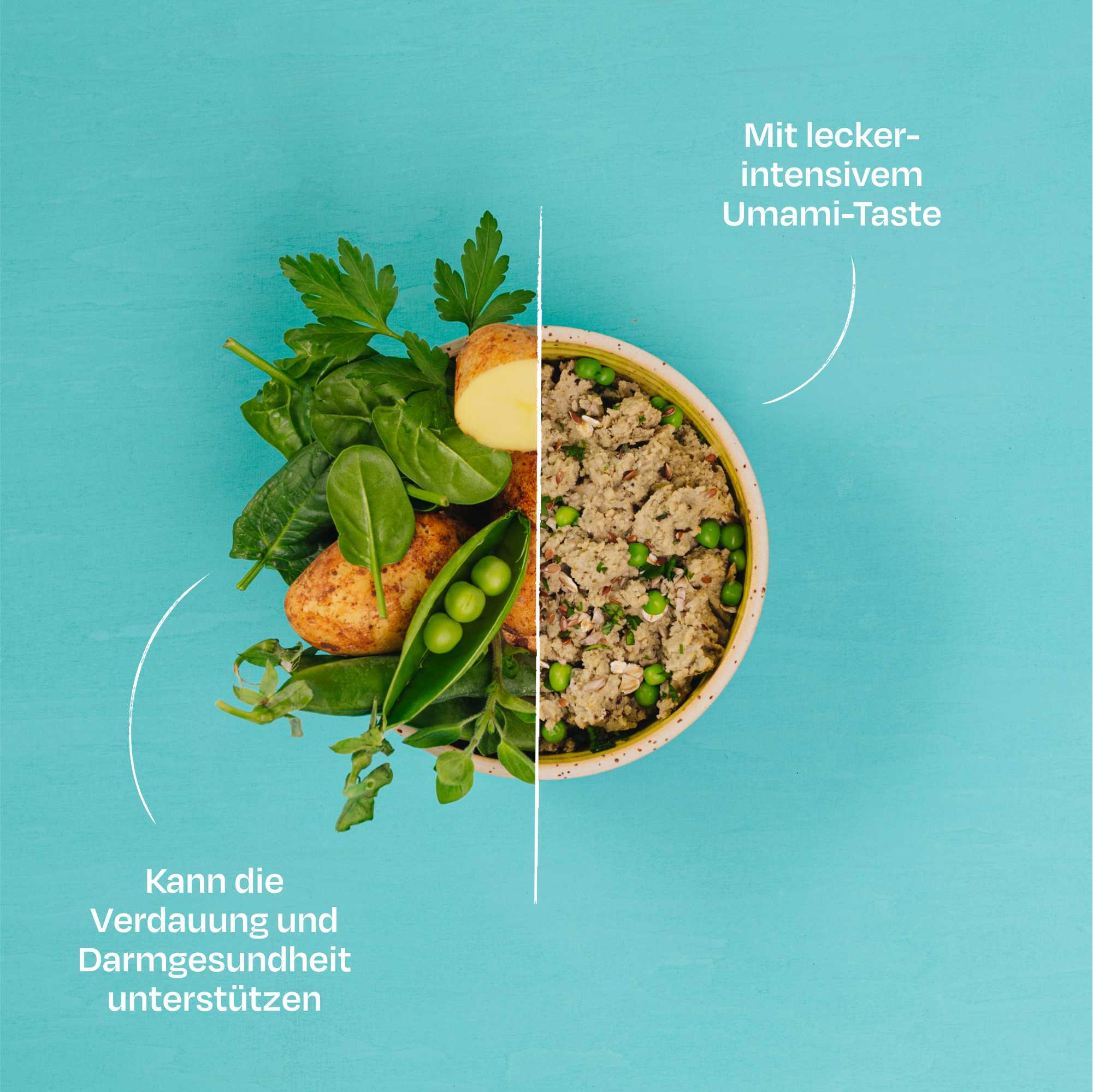 Das von uns entwickelte Mineralpulver, das weitere essenzielle Nährstoffe wie Vitamin B12, Taurin und Carnitin liefert, ergänzt die gesunden Inhaltsstoffe des enthaltenen Gemüses wie Kartoffeln, Brokkoli und Erbsen. Unsere geheime Hefe-Mischung rundet die Rezeptur ab und zaubert einen aromatisch-intensiven Geschmack auf 100 % natürlicher Basis. Falls du es noch nicht wusstest: Umami ist das japanische Wort für „wohlschmeckend“ und bringt eine unvergleichliche Geschmackstiefe in unser Futter.